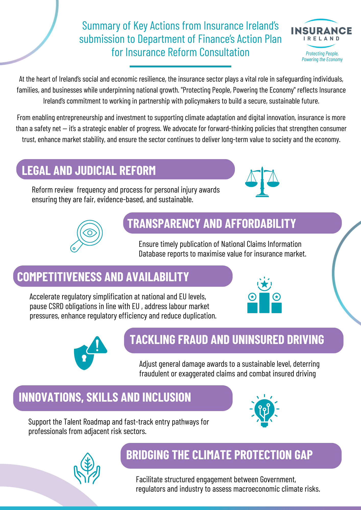 In May 2025, Insurance Ireland, along with many other interested parties, submitted a detailed response to a Department of Finance Consultation on a new Action Plan for Insurance Reform. You can find an inforgraphic of what Insurance Ireland sought at the bottom of the page.